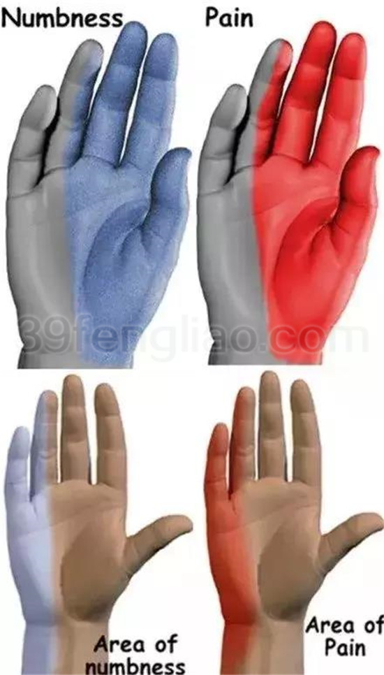 腕管综合征(上)与肘管综合征(下)的麻木、疼痛区域