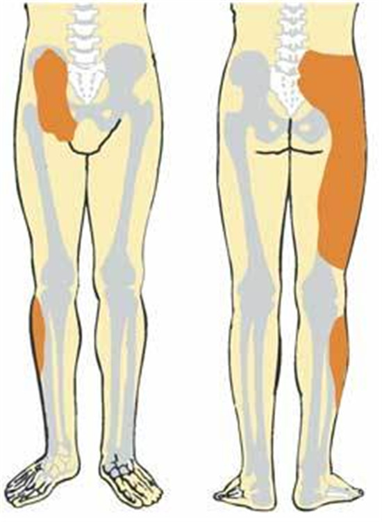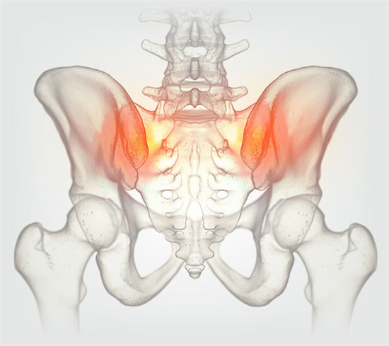 2.骶髂关节疼痛的牵连模式,通常是臀部(94%)、下腰椎位置(72%)、小腿(28%)、腹股沟位置(14%)及足部疼痛(12%)。分散到上腰椎位置(6%)及腹部(2-6%)的疼痛是较为罕见的 。