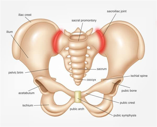骶髂关节是人体中最大的中轴关节,平均表面积为 17.5 平方厘米 ,成人骶髂关节面积的差异可以很大 。骶髂关节普遍被描述为一个大而形状像耳廓,且可活动的滑膜关节。其后方没有关节囊,被大群韧带的结构覆盖著,把骶骨与髂骨连接在一起。韧带群是关节的静态稳定器。此外,一组肌肉网络(包括臀大肌、梨状肌及股二头肌)支撑著骶髂关节,以稳定骨盆骨骼。
