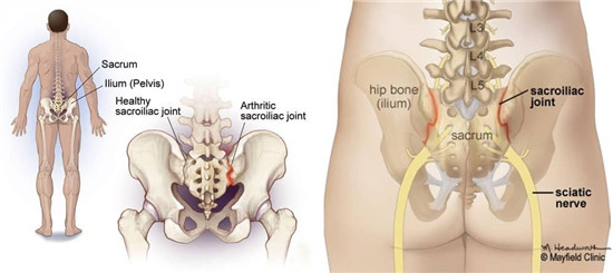 骶髂关节受伤包含中轴负荷与突然旋转两种成因。这受伤可带来滑囊或滑液破坏、滑囊及韧带绷紧、关节活动度不足或过大、外来的压力或剪力、异常的关节力学、微骨折或大骨折、软骨软化、软组织受损及发炎 。