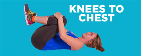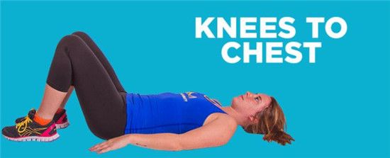 也可以双腿完成抱膝的动作(下图),双手抱膝向上拉起至下背部和臀部有牵拉感,保持8-10秒然后慢慢放下来,重复6-8次。