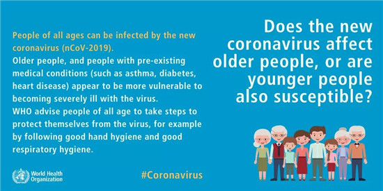 世卫组织建议所有年龄段的人采取措施保护自己免受病毒感染,如保持手部清洁等健康的卫生习惯。