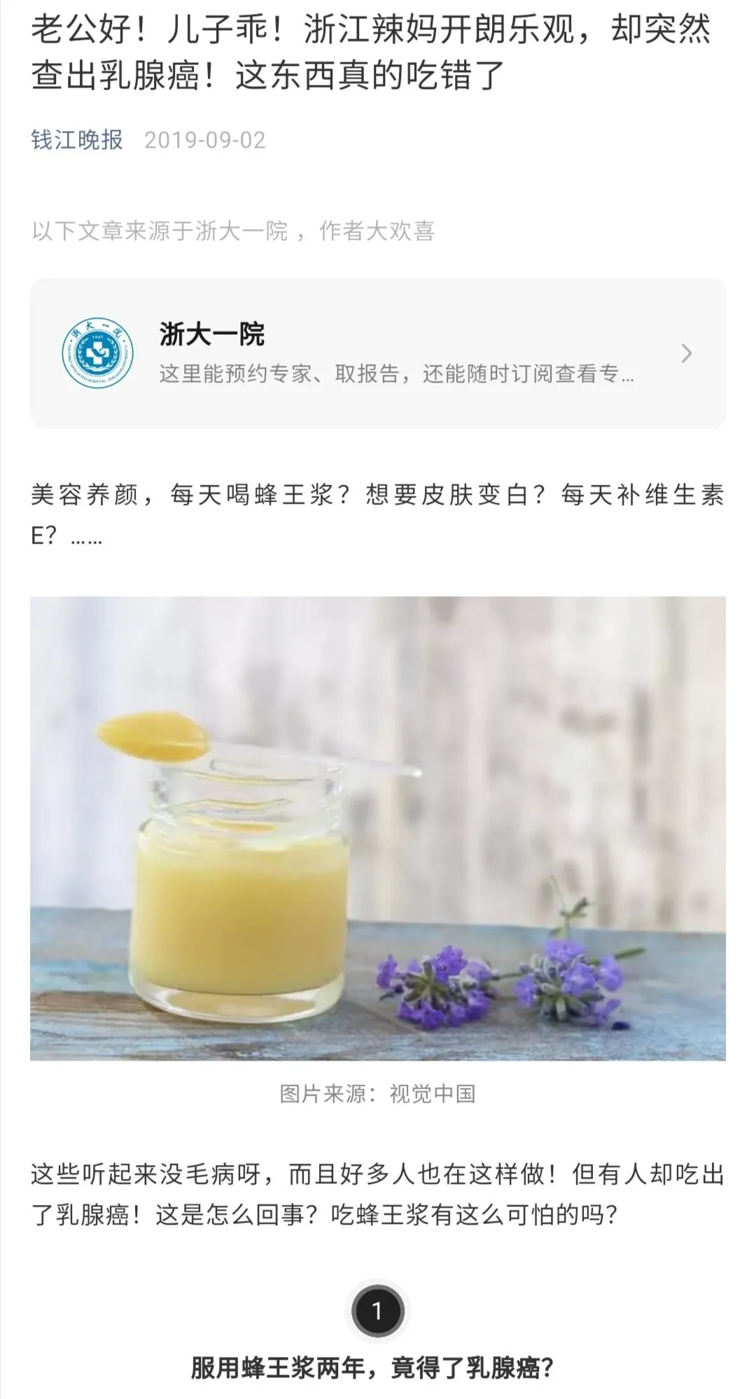 如上图所示,这篇报道中将蜂王浆和乳腺癌直接挂钩了,在谈癌色变的现代社会中,显然这篇报道很有杀伤力,很能够吸引眼球。但这篇报道真的就这么客观学术吗?