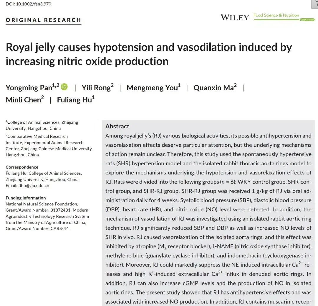 第一个研究中,胡教授的团队发现蜂王浆通过增加一氧化氮(NO)的产生起到降低血压和舒张血管的作用。此外,蜂王浆中含有毒蕈碱受体激动剂,可能是乙酰胆碱样物质,通过NO/cGMP途径和钙通道诱导血管舒张。论文发表在国际学术期刊《食品科学及营养》杂志上[3]。