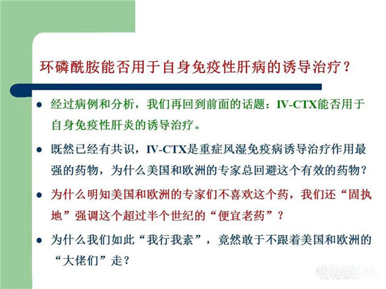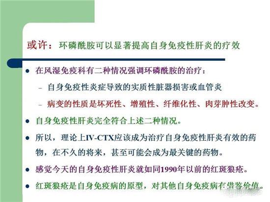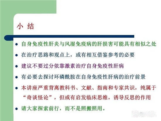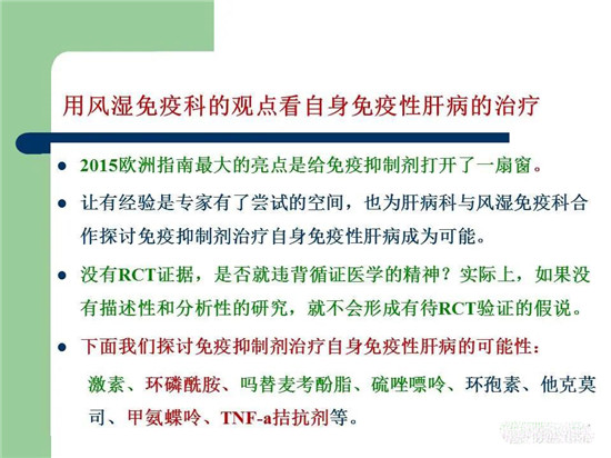 今晚围绕着这个思路,演讲的题目是《思维奔溢地谈:自身免疫性肝损害的药物治疗》,PPT放上来供风湿免疫科、肝病科、消化科医生参考和讨论。