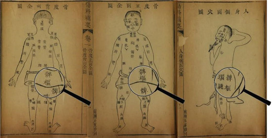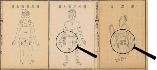 用髋关节来理解“髀枢”,虽然说二者之间不能完全画等号,但是也算是相比之下较为直观、贴切的了。从这个角度理解,在身体的前方、后方和侧面,都是能够触摸到髀枢的,我认为,这应该就是《伤科补要》中的配图要表达出来的意思。