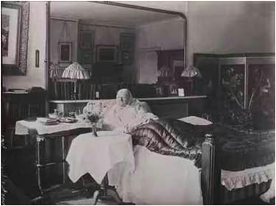 这幅黑白色照片是1910年南丁格尔去世前,摄影师在她位于距离伦敦海德公园只有一箭之隔的南街家中为她拍摄的,九十岁的南丁格尔当时一头银灰色头发。