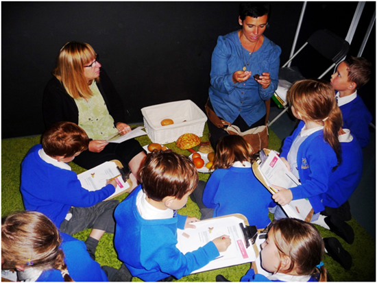 博物馆的工作人员在给小学生们讲解南丁格尔的故事并做演示,孩子们认真听讲并做笔记。