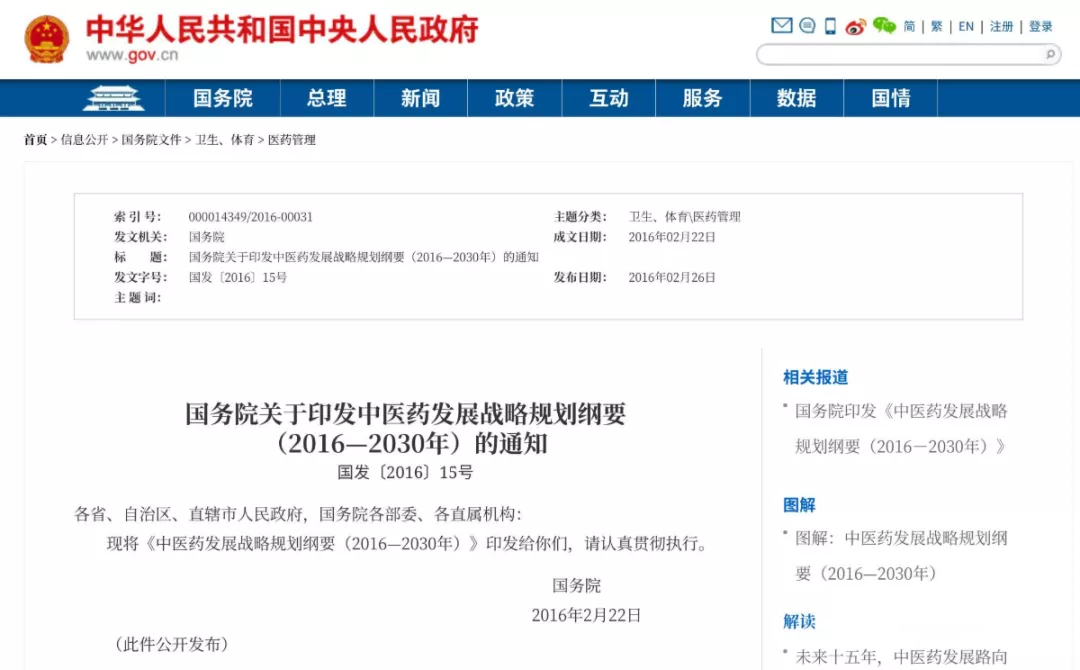 近年来,中医药的作用和地位受到国家重视和维护。早在2016年,政府就颁布了《中医药发展战略规划纲要(2016—2030年)》(以下简称纲要),这份长达15年的规划,透露出国家对发展中医药的坚定决心。中医药发展作为国家发展战略之一,被高度重视。