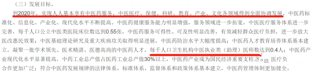 政府对中医药发展制定的目标,具有前瞻性:实现人人基本享有中医药服务、每千口卫生机构中医执业类(助理)医师数达到一定规模。如今时间的车轮已经驶进2020年,我们可以看到这样的目标制定也是伟大的。