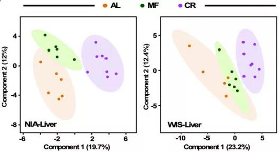 NIA和WIS饮食方案下,小鼠随意进食(AL)、只吃一顿(MF)和热量限制(CR)肝脏代谢组的差异