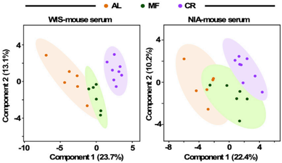 NIA和WIS饮食方案下,猴子随意进食(AL)、只吃一顿(MF)和热量限制(CR)血清代谢组的差异