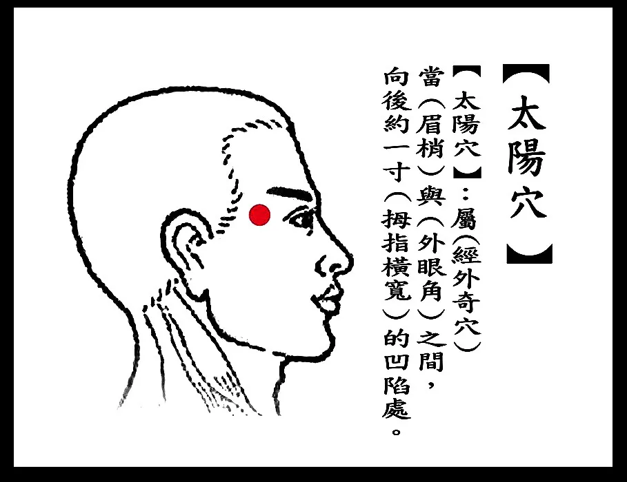 6、頭痛:可用雙手食指分別按壓頭部雙側太陽穴 (位於眉梢與外眼角中間向後1寸凹陷處),壓至有脹痛感並按順時針方向旋轉1分鐘,頭痛便可減輕。
