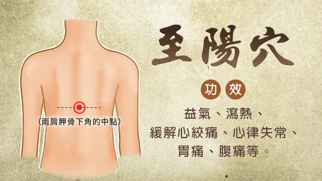 8、心絞痛:發作時常常伴有胸部壓迫感、窒息感等。此時可按壓至陽穴 (位於第7胸椎棘突下凹陷處),一般按壓3~6分鐘,心絞痛即可得到有效緩解。