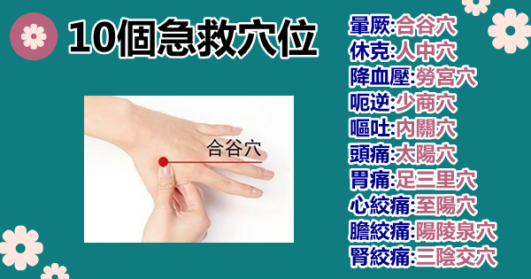 1、暈厥:中暑、中風、虛脫時,病人突然昏倒,不省人事,面色蒼白,大汗淋漓。這時,家人可用大拇指捏壓患者合谷穴 (位於手背部位,第2掌骨中點,拇指側),持續2~3分鐘,即可緩解。