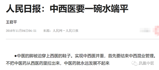 《人民日报》曾发文,实现中西医并重,首先要结束中西混业管理。中西医不能平起平坐,主要源于中医西管。用西医的观点管理中医,中医在发展上确实受到了较大程度上的限制。