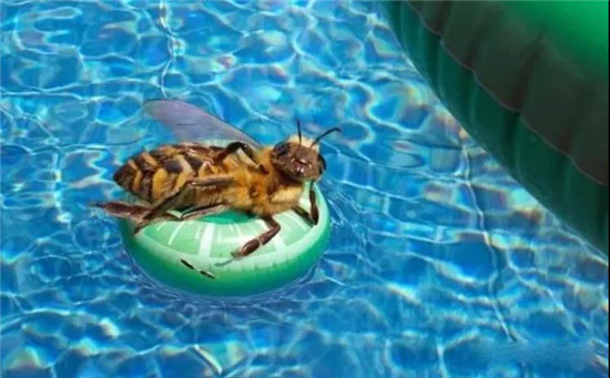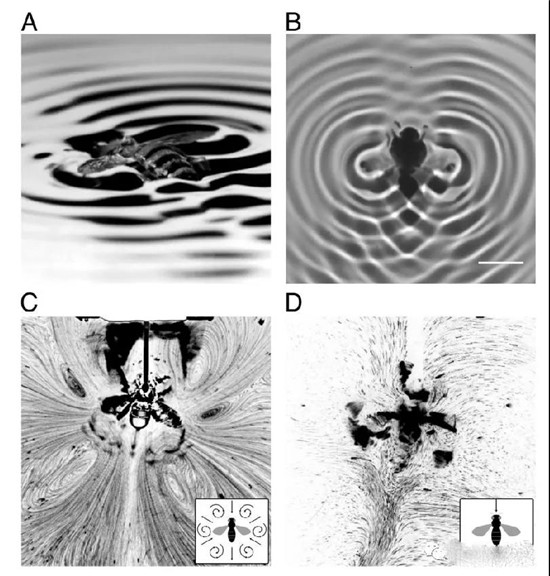 在研究了33只蜜蜂后发现:蜜蜂落在水面,翅膀粘上水后失去飞行能力,但是,水的 “粘性”会使蜜蜂在振动翅膀后产生水波浪,从而推动其前进。