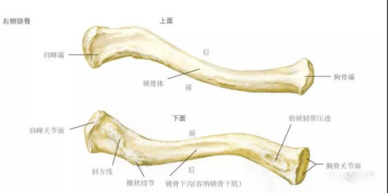 1.锁骨:正面呈S形,由肩峰延伸至胸骨柄