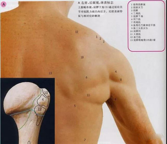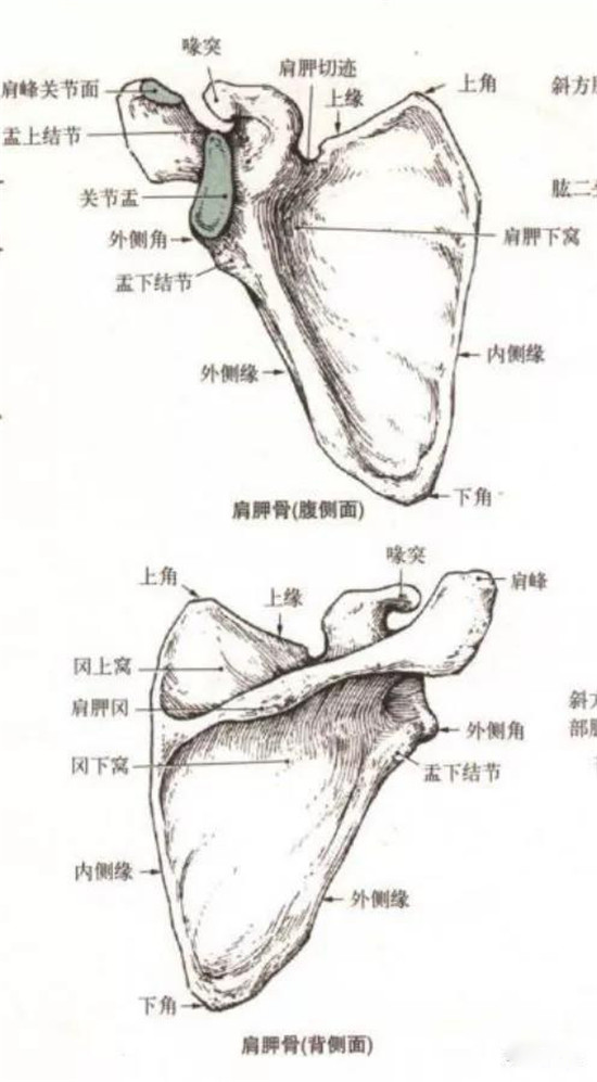 肩胛骨外上方的梨形浅窝,称关节盂,与肱骨头相关节。盂上、下方各有一粗糙隆起,分别称盂上结节和盂下结节。