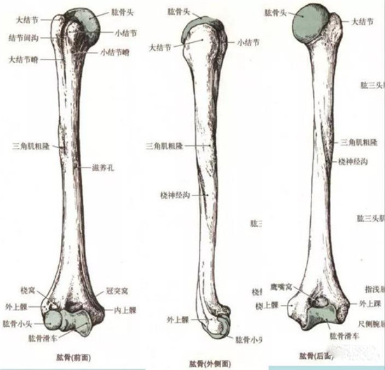 肱骨头的外侧和前方有隆起的大结节和小结节,向下各延伸一嵴,称大结节嵴和小结节嵴。两结节间有一纵沟,称结节间沟。