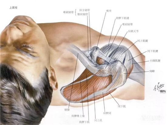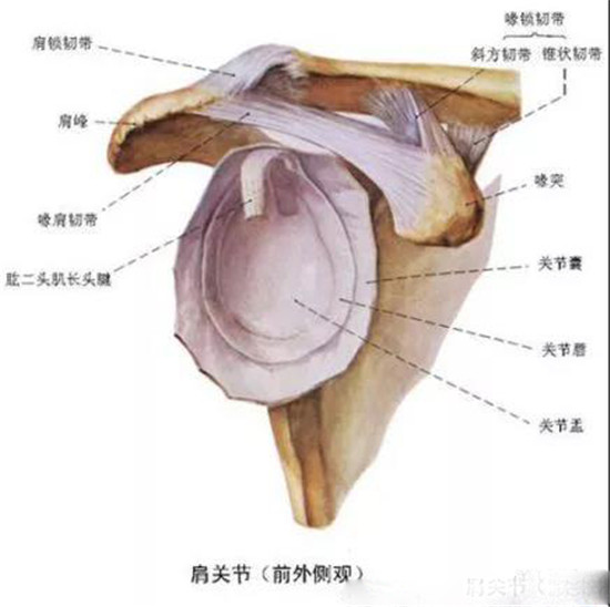2、喙肩韧带:为肩关节上部的屏障,起于喙突外缘,基底较宽逐渐变窄,向外止于肩峰,把肩峰下滑囊与肩锁关节分开。