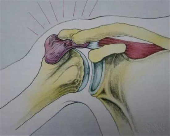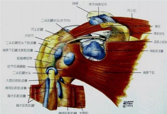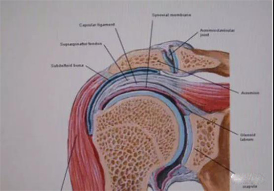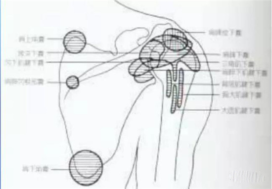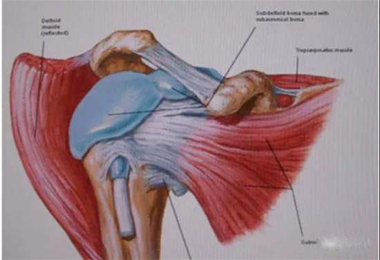 95%的患者肩峰下滑囊和三角肌下滑囊是相通的。滑囊和关节之间隔以肩袖。因此,肩袖完全撕裂后可导致滑囊与关节之间相通。