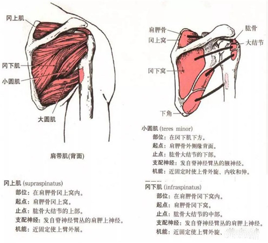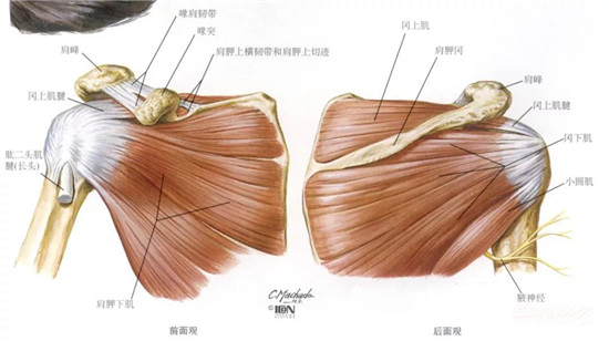 1.冈上肌位于肩胛冈上方的冈上窝,止于肱骨大结节的上端。肩峰下滑囊将其与肩峰、三角肌和喙肩韧带相隔离。