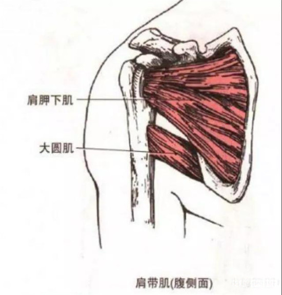 3.再往下为小圆肌,止于肱骨大结节的下端。这三条肌腱形成肩袖的上后部分,肌腱之间分界不明显。