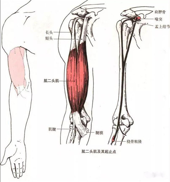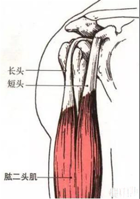 呈梭形,起端有两个头,长头以长腱起自肩胛骨盂上结节,通过肩关节囊,经结节间沟下降;短头在内侧,起自肩胛骨喙突。两头在臂的下部合并成一个肌腹,并以一个腱止于桡骨粗隆。