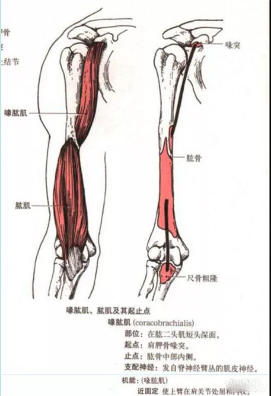 喙突为肱二头肌短头肌腱和喙肱肌提供起点,同时还是胸小肌和肩锁韧带的附着点。
