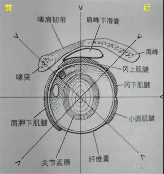 1、喙肱韧带:起于喙突下,向侧前下方固定于肱骨,相当于冈上肌及肩胛下肌附着点之间。其纤维与关节囊紧连在一起。这个韧带对肱骨头起支持及防止肱骨过度外旋的作用。冰冻肩时此韧带广泛发炎,结果使肱骨头保持在内旋位置,防碍了肩关节的活动。