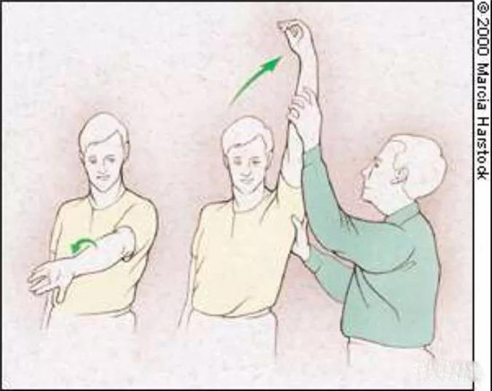 肩极度内旋,肩胛骨平面前屈上举,当出现疼痛时,将肩外旋继续上抬,疼痛减轻或消失为阳性。