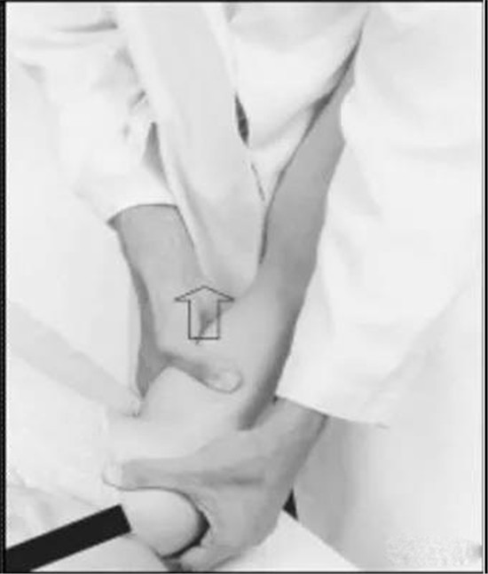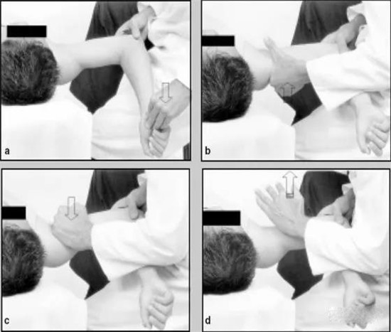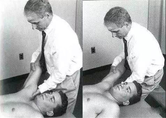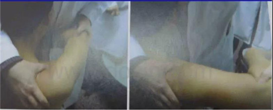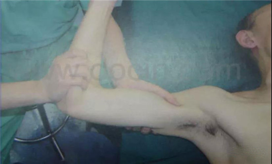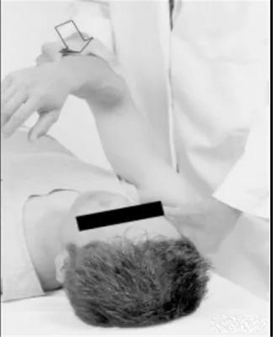 患者仰卧位,检查者一手抓住患肢前臂近肘关节处,另一手置于患肢肱骨头下方;抓住前臂的手施力将肱骨头压迫进盂窝,然后另一手向前后方移动肱骨头,并判断肱骨头移位程度。
