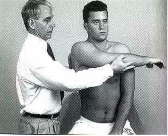 检查者立于患者后方,使患者肩关节内收位前屈90度,肘关节屈曲90度,前臂保持水平。检查者用力使患侧前臂向下致肩关节内旋,出现疼痛者为试验阳性。