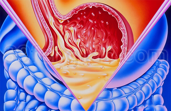 胃内一次性进入大量液体食物,而消化液的生成还是按照自己的节奏缓慢的进行,此时食物与消化液的比例出现了不合理,没过多长时间第二个三分之一碗的粥又下肚了,很快一碗粥就全部喝下去了,这时胃内食物量迅速增加,消化液却很少,胃内食物的比例不符合消化要求,幽门检测后发现食物不符合消化要求,幽门就会关闭,幽门要等待消化液大量产生,使胃里的食物混合比符合消化要求,在等待消化液产生的过程中,胃粘膜同时会产生大量的胃酸(盐酸)。