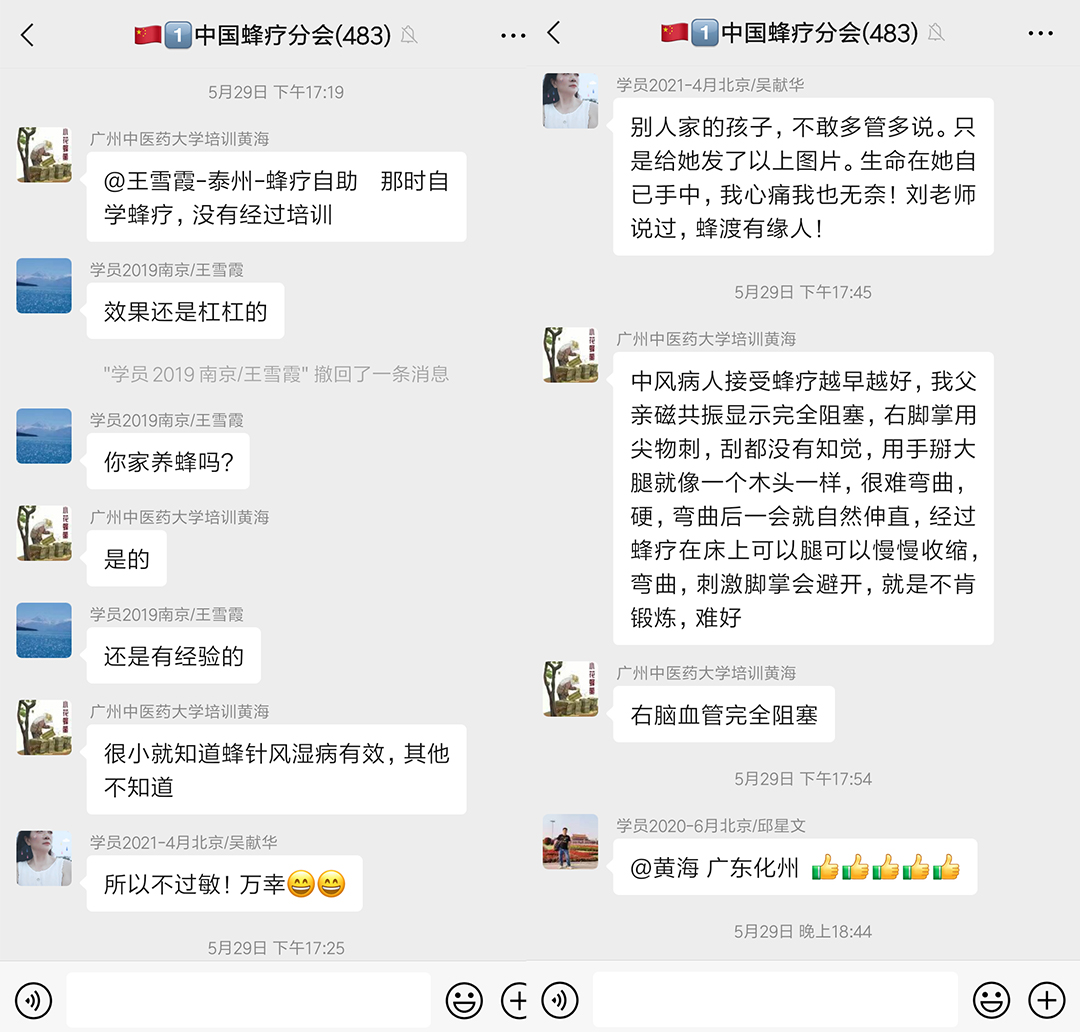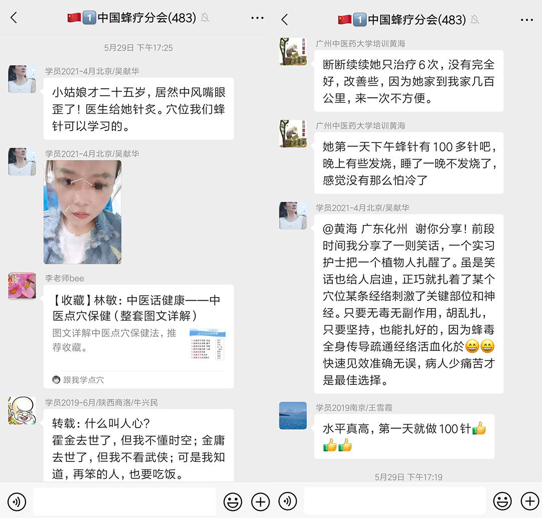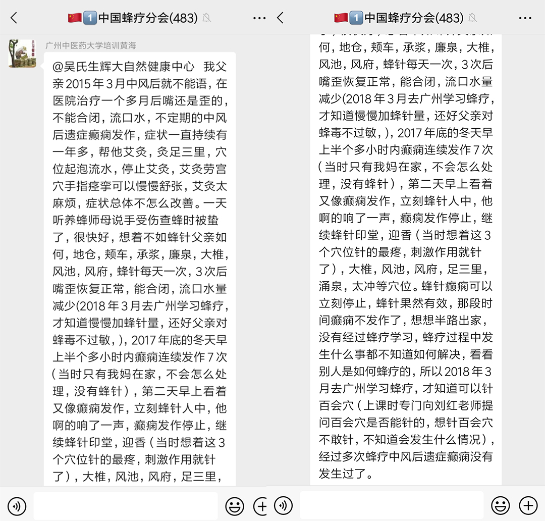 蜂针癫痫可以立刻停止,蜂针果然有效,那段时间癫痫不发作了,想想半路出家,没有经过蜂疗学习,蜂疗过程中发生什么事都不知道如何解决,看看别人是如何蜂疗的,所以2018年3月去广州学习蜂疗,才知道可以针百会穴(上课时专门向刘红老师提问百会穴是否能针的,想针百会穴不敢针,不知道会发生什么情况),经过多次蜂疗中风后遗症癫痫没有发生过了。