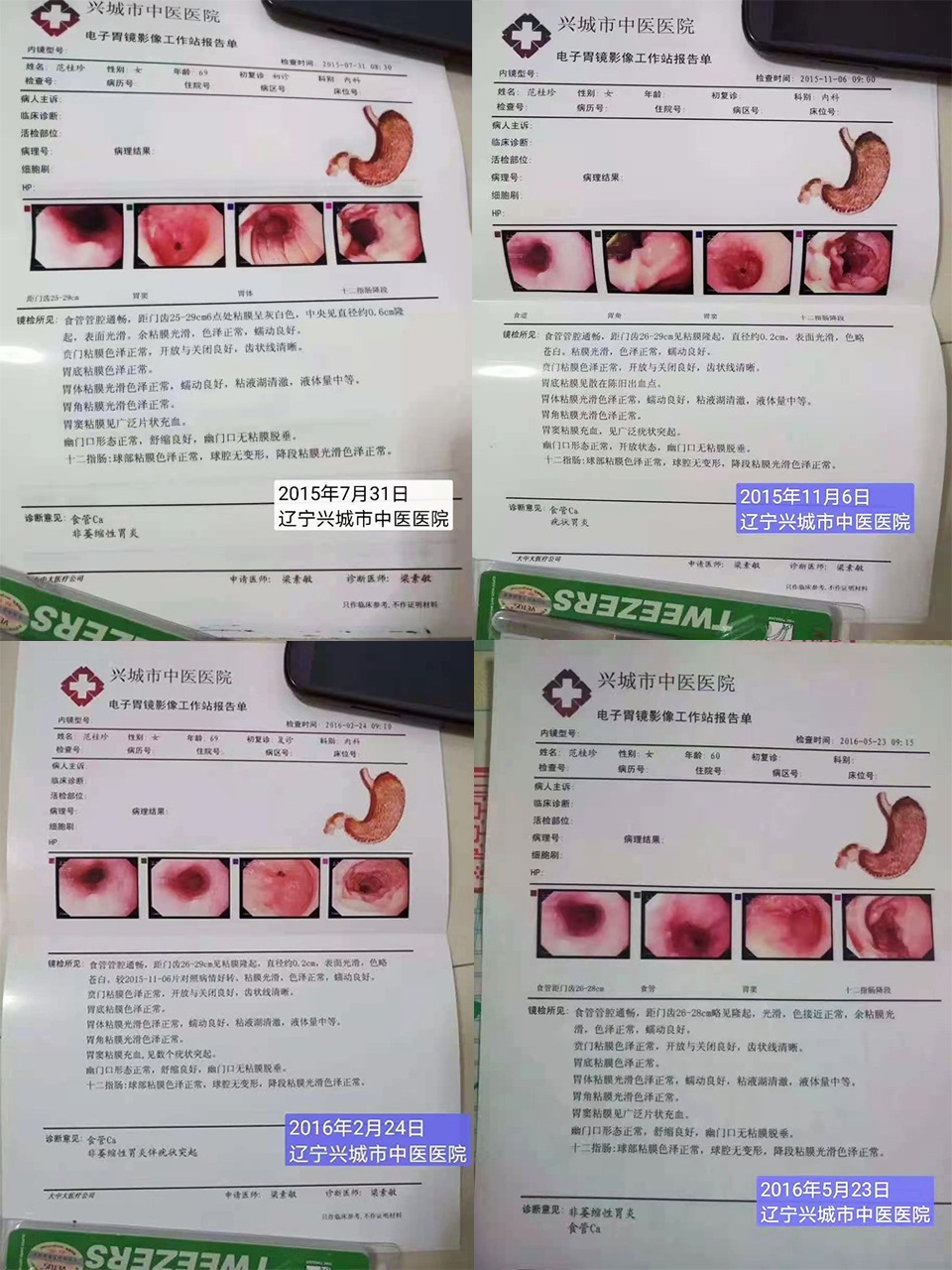 辽宁省葫芦岛市食道癌中下段早中期患者范某,女,现年76岁,2014年10月在辽宁省兴城市中医医院被确诊为早中期食道中下段癌,患者本人一直不愿意手术及放化疗,2015年1月13日,在北京中国医学科学院肿瘤医院被确诊为食道癌。