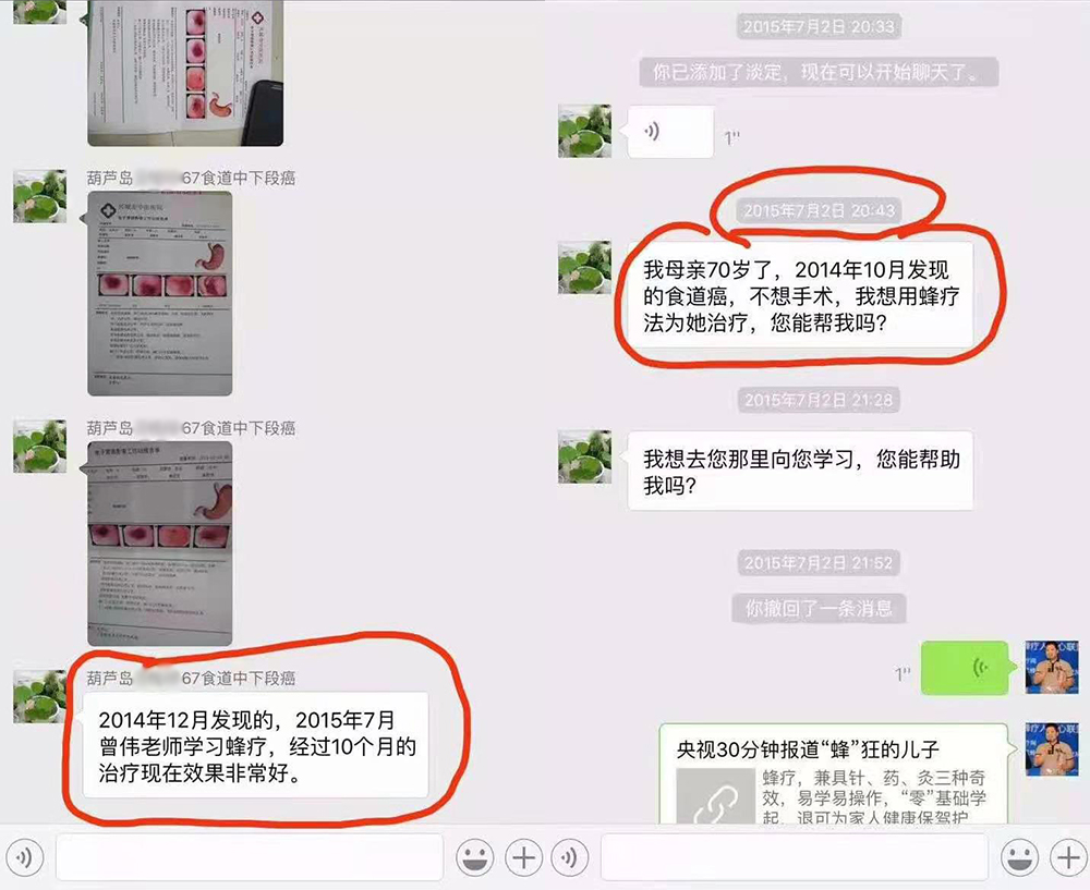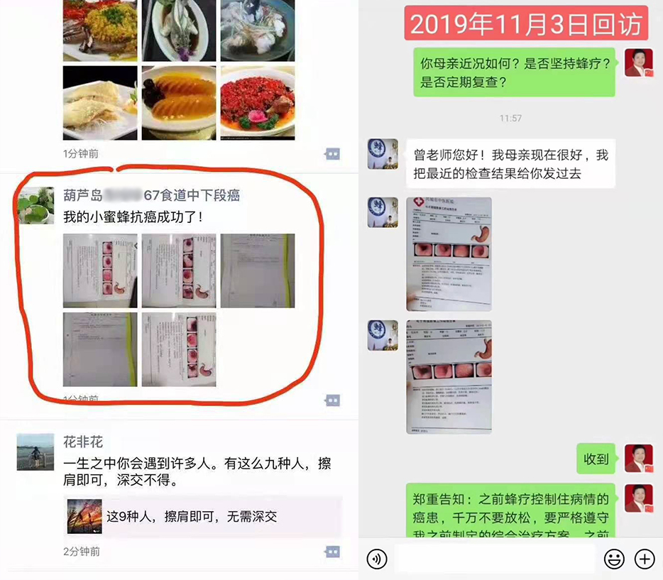 认真听取并遵从曾伟老师的建议,以蜂疗结合西医化疗,在化疗期间和化疗后均进行蜂疗,有效的缓解了化疗过程中对患者带来的副作用,达到事半功倍的效果。