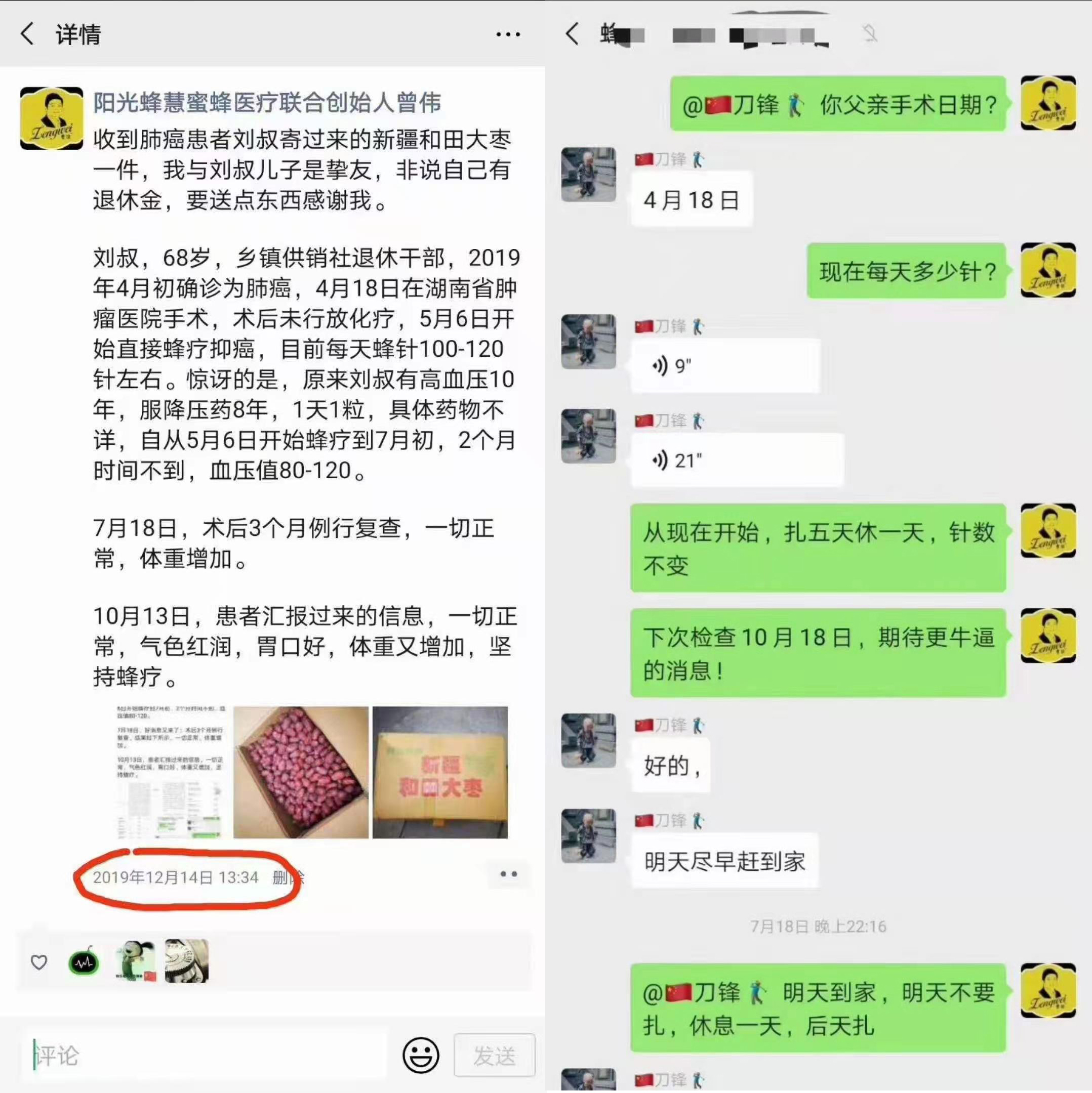 认真听取并遵从曾伟老师的建议,以蜂疗结合西医化疗,在化疗期间和化疗后均进行蜂疗,有效的缓解了化疗过程中对患者带来的副作用,达到事半功倍的效果。