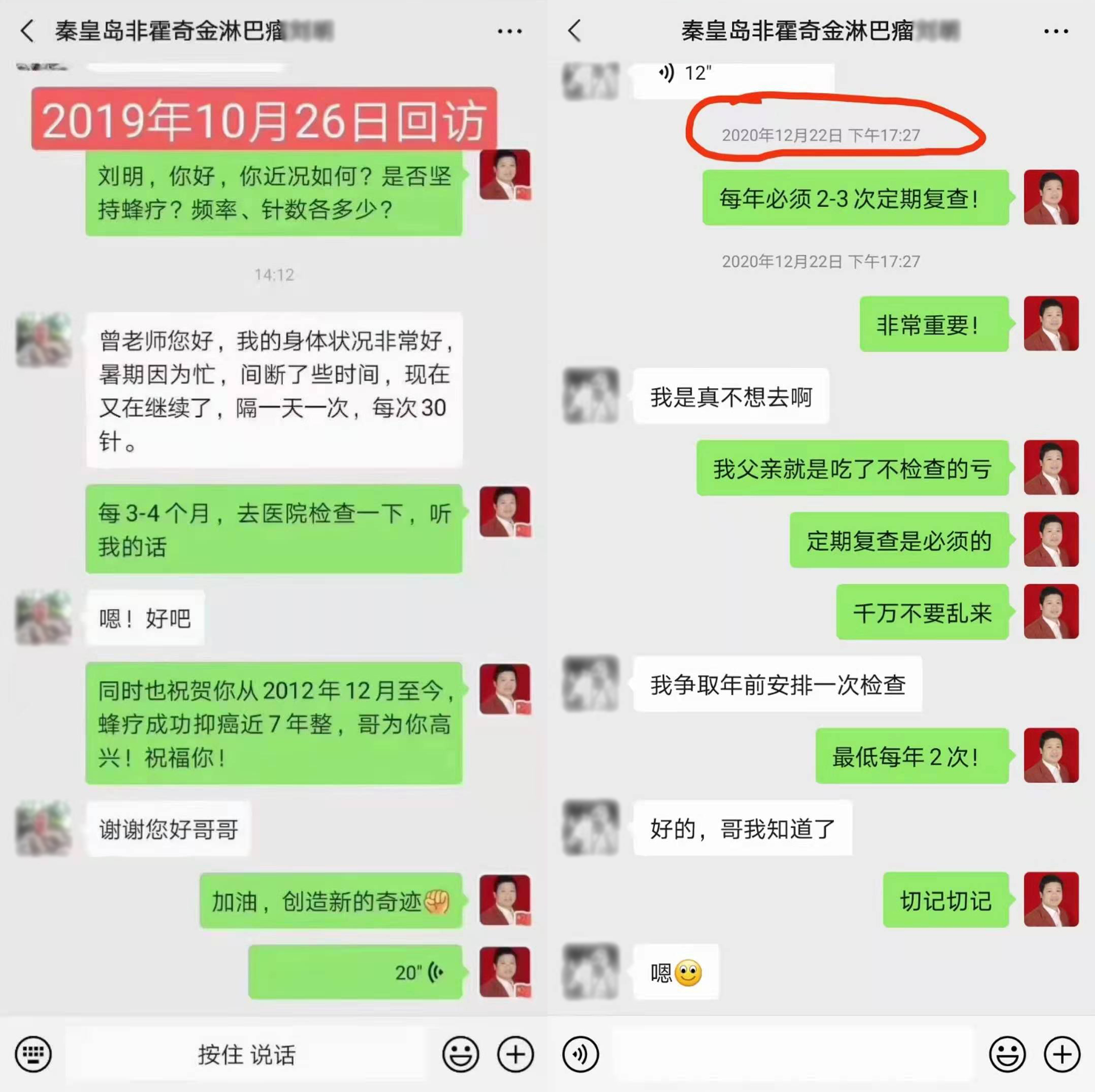认真听取并遵从曾伟老师的建议,以蜂疗结合西医化疗,在化疗期间和化疗后均进行蜂疗,有效的缓解了化疗过程中对患者带来的副作用,达到事半功倍的效果。