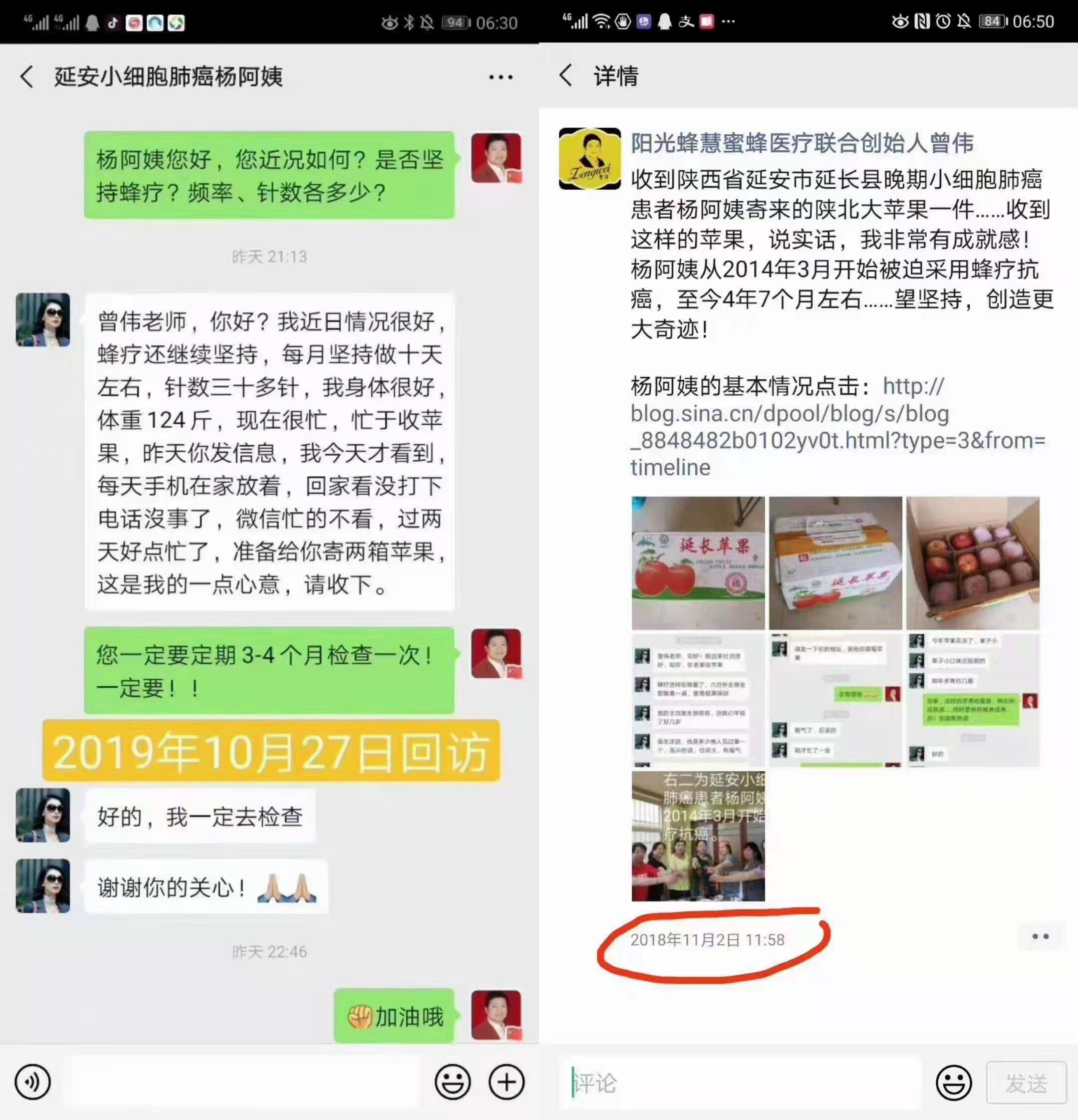 刘祝贺陕西省延安市延长县晚期小细胞肺癌患者杨阿姨从2014年3月开始蜂疗抗癌,至今奇迹生存7年5个月!