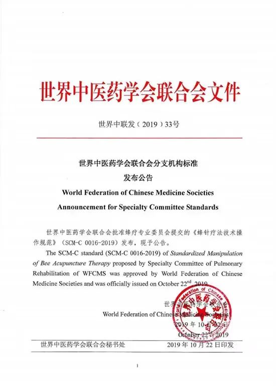 2018年11月9日,在深圳召开的“世界中联蜂疗专业委员会一届二次理事会议”上正式发布《蜂针疗法技术操作规范 》标准获批立项的喜讯公告!经过一年时间,在各位专家团队的共同努力下,该标准于2019年11月22日第二届世界蜂疗大会暨世界中联蜂疗专业委员会理事会议上正式颁布。