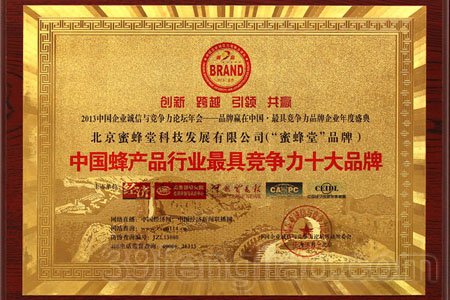 2013年5月,在全国开展的“品牌赢在中国信用中国典范”主题公益调查活动中,蜜蜂堂品牌荣获“中国蜂产品行业最具竞争力十大品牌”。此次活动按照市场占有率、影响力、用户满意度、品牌美誉度、社会责任、企业文化六个指标参数,依据“组委会推荐、公众投票、评委审核”三方数据评分结果,进行严格评审。