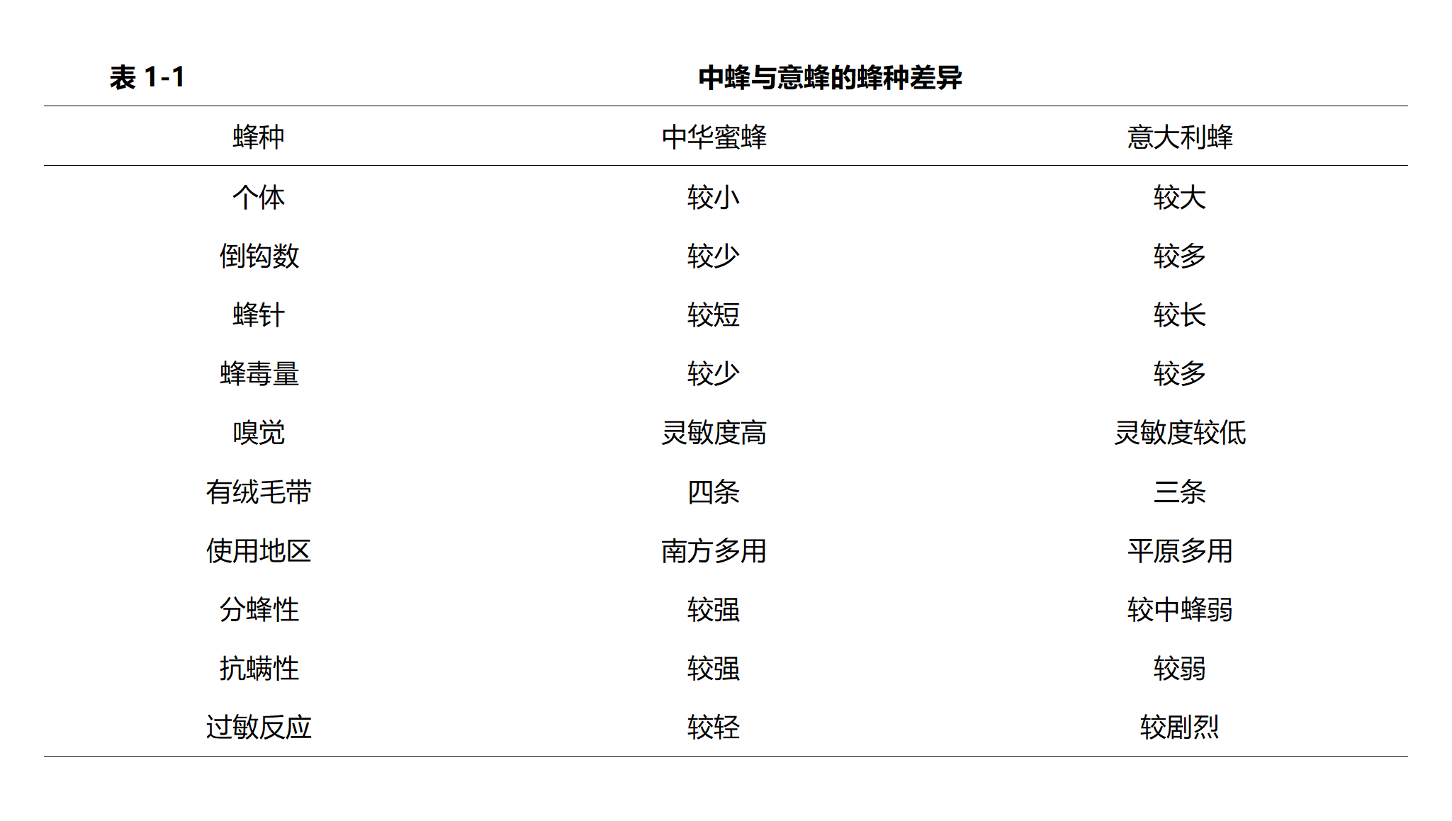中华蜜蜂与意大利蜂的蜂种差异见表1-1: