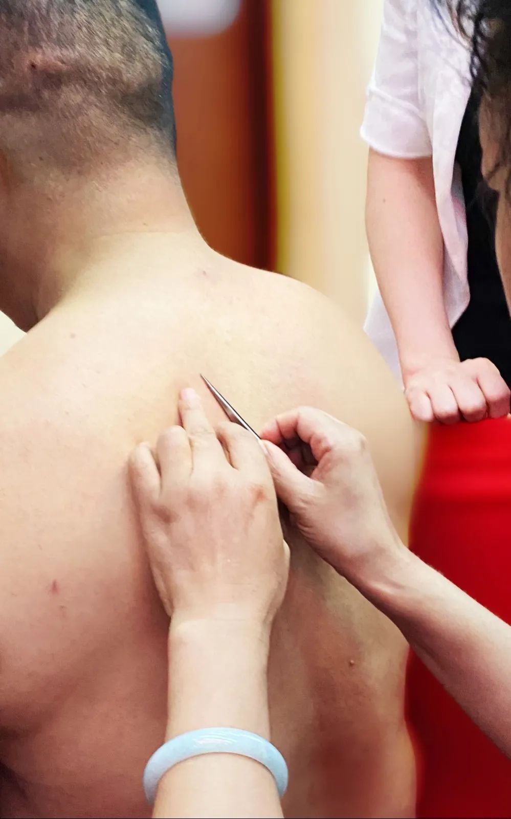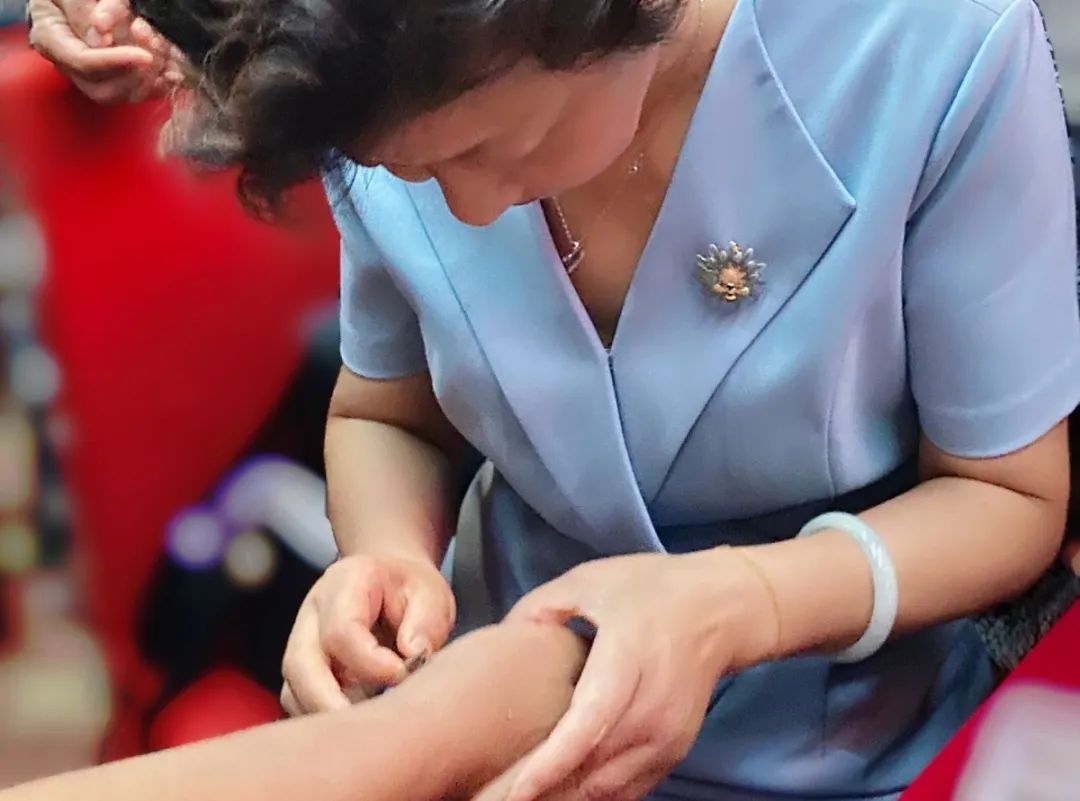 刘红老师在实操教学现场让学员们体验无痛蜂疗手法及减毒刺法