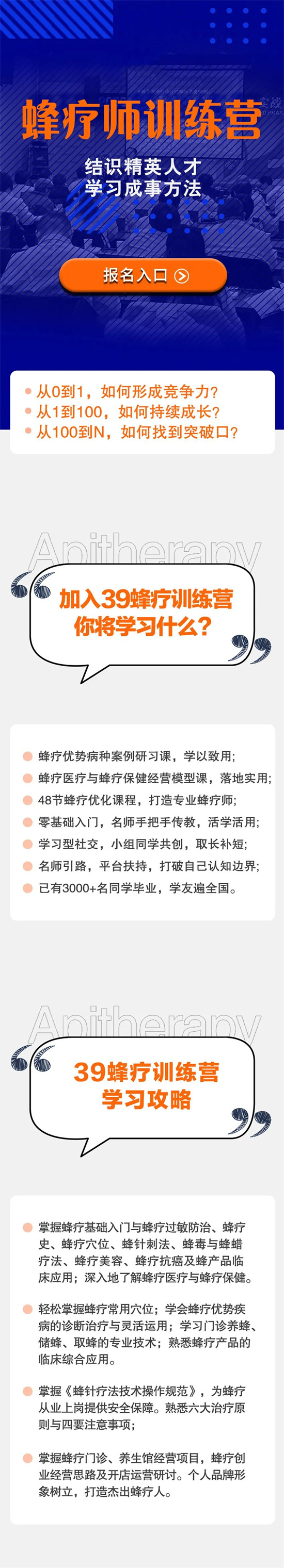 中医蜂疗,大道至简。蜂疗师训练营将在行业专家学者的倾囊相授下,简化学习流程、精炼学习技能,帮助每一位蜂疗从业者的成长与成才。