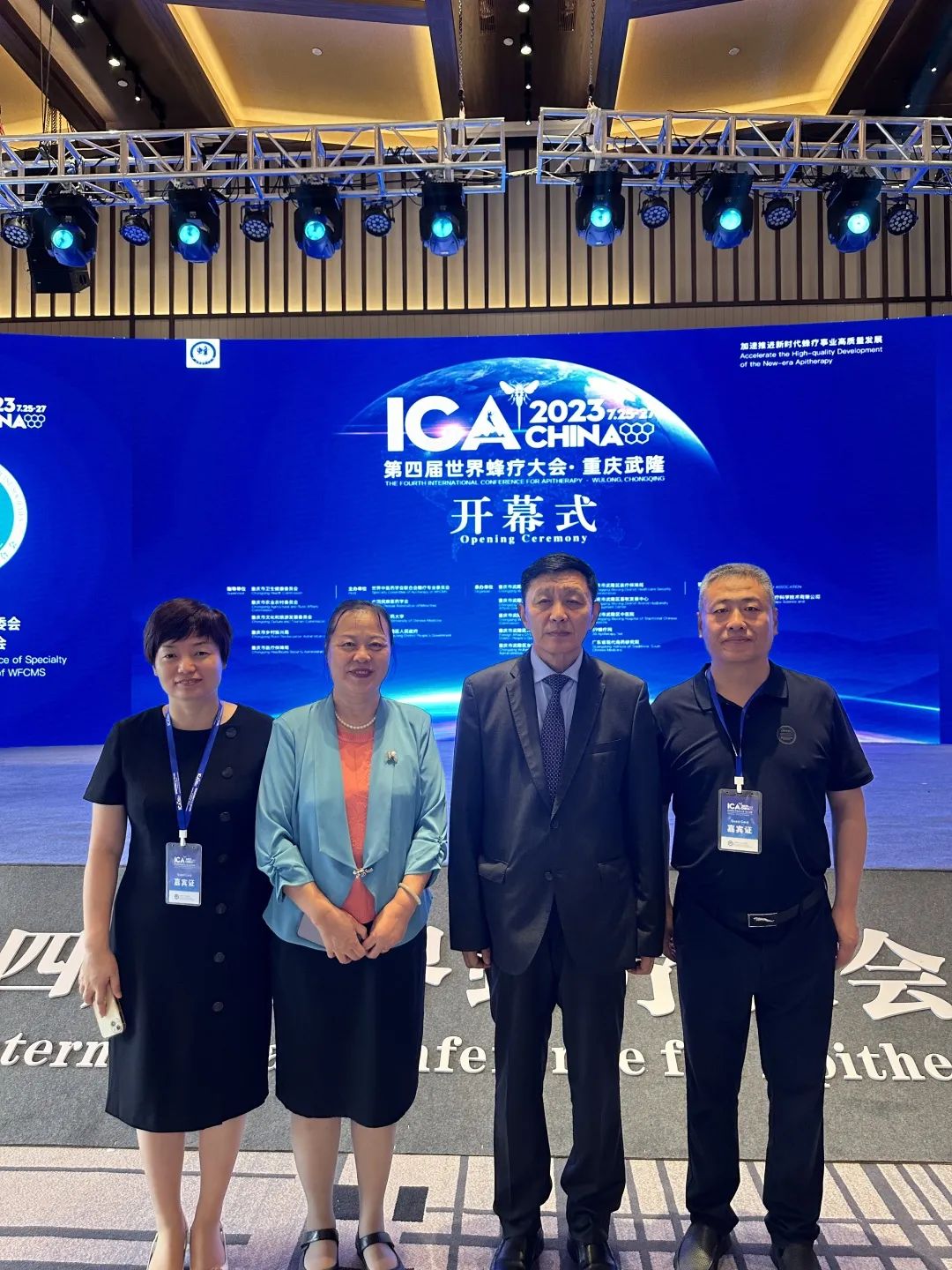 康平利主任在第四届世界蜂疗大会上与世界中医药学会联合会桑滨生副主席兼秘书长、中国民族医药学会李万瑶会长、陕西省渭南市中医医院王卫力院长亲切交流