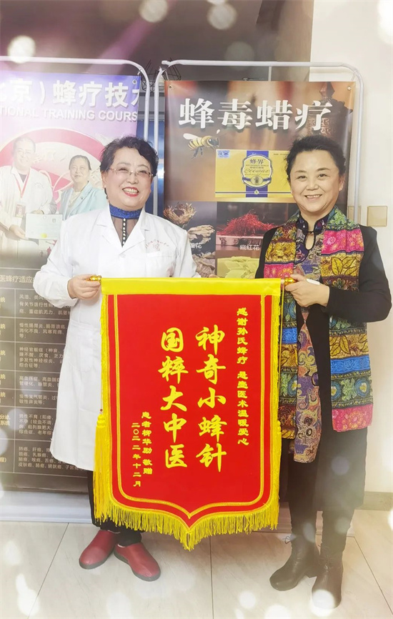 她用行动诠释对蜂疗事业的执着与热爱,关心着身边的每一个家人和朋友。当她听说老年大学的一位朗诵教师嗓子淋巴增生,已无法正常说话,于是她就立马向这位老师详尽介绍了中医蜂疗法,这位老师半信半疑的前来尝试了蜂疗,她和儿子二人精心为患者提供了专业的调理方案,先由线上蜂疗专家会诊,给出方案:用无痛蜂针+蜂毒蜡+蜂三宝综合调理,经过10次调理后,这位朗诵老师的嗓子就这样神奇般的康复了!还送来了感谢的锦旗,这是母子俩莫大的鼓励!蜂遇有缘人啊……