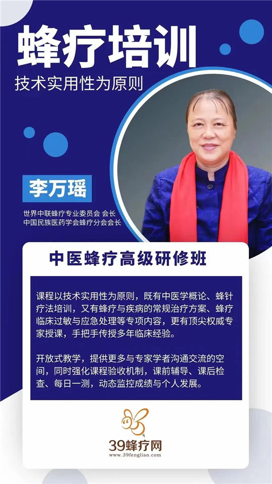 蜂疗师特训营,由当代蜂疗奠基人李万瑶教授领衔主讲,蜂疗界多位著名一线蜂疗专家手把手传教,零基础也可入门,学完即可活学活用,是专为实战而打造的实用课程;也为报考确有专长中医师、中医师承的蜂疗学子提供专业的基础教育学习辅导。