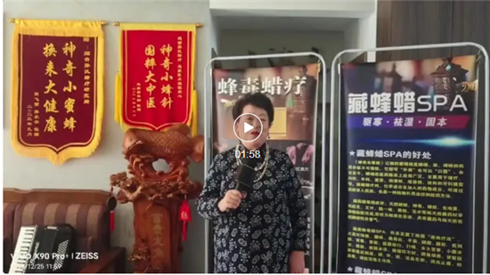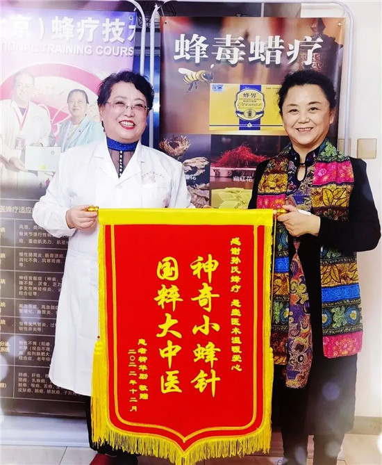 她用行动诠释对蜂疗事业的执着与热爱,关心着身边的每一个家人和朋友。当她听说老年大学的一位朗诵教师嗓子淋巴增生,已无法正常说话,于是她就立马向这位老师详尽介绍了中医蜂疗法,这位老师半信半疑的前来尝试了蜂疗,她和儿子二人精心为患者提供了专业的调理方案,先由线上蜂疗专家会诊,给出方案:用无痛蜂针+蜂毒蜡+蜂三宝综合调理,经过10次调理后,这位朗诵老师的嗓子就这样神奇般的康复了!还送来了感谢的锦旗,这是母子俩莫大的鼓励!蜂遇有缘人啊……